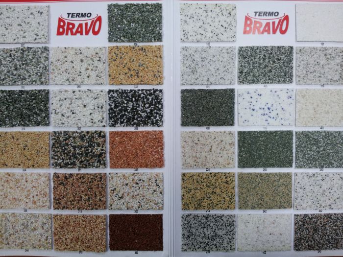 Мозаичная гранитно-мраморная штукатурка ТЕРМОБРАВО® производится в двух вариантах: мелкий камень 1мм., крупный камень 1,5мм.